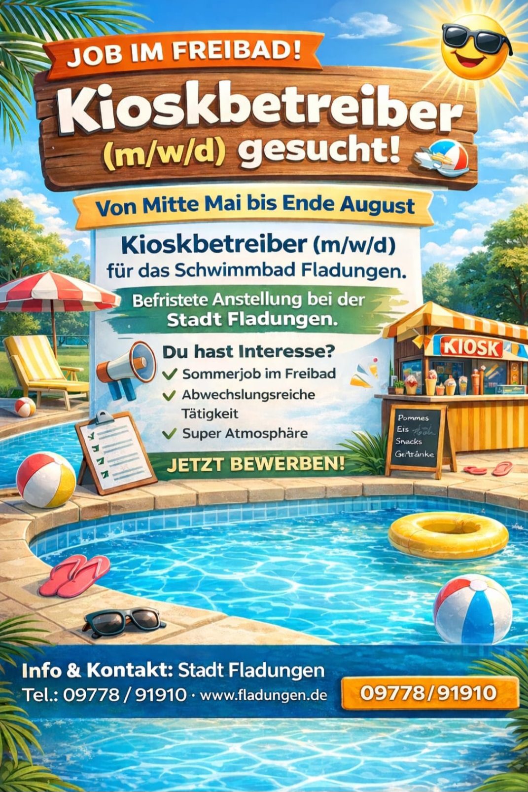 Das Freibad Fladungen sucht für die diesjährige Saison einen Kiosbetreiber von Mitte Mai bis Ende August. Weitere Informationen erhalten Sie bei der Stadt Fladungen unter 09778-91910.